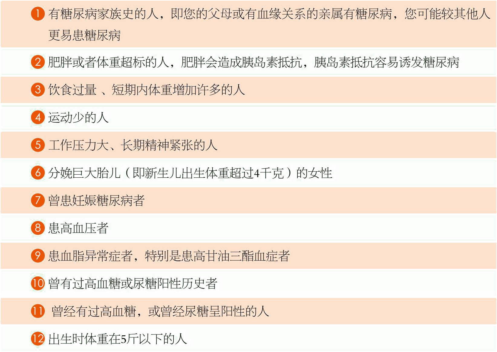 糖尿病的高危人群也称好发人群,是指容易得糖尿病、但目前血糖还正常的人群。有下列情况的人都要警惕糖尿病的到来!