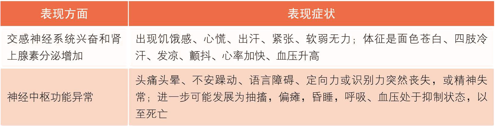 当血糖水平下降得太快或降得太低(低于2.8毫摩尔/升或50毫克/分升)时,就可能出现低血糖,表现为饥饿、发慌、头晕、手脚发抖、冒汗、心跳加速等症状,严重者会抽搐、昏迷。严重的低血糖或低血糖昏迷,如果不及时抢救,延误6小时以上就会严重损伤糖尿病患者的大脑,甚至造成死亡。