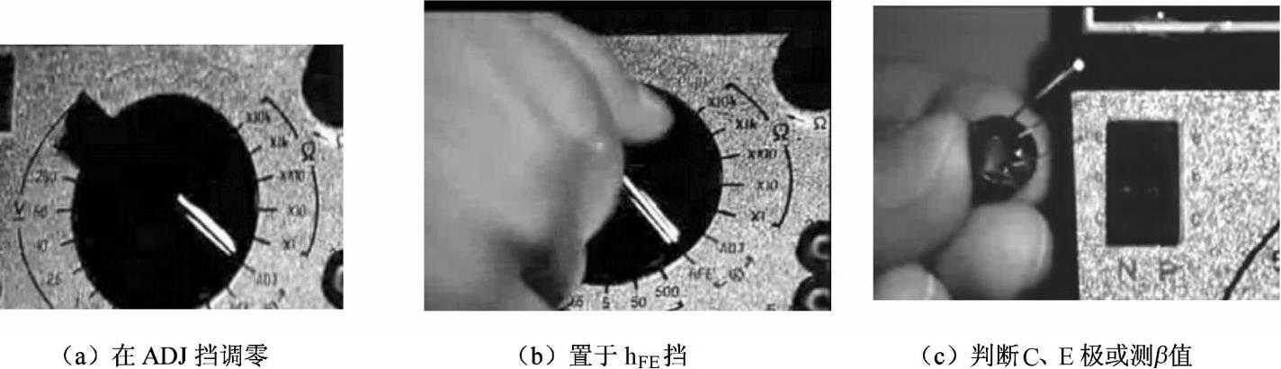 ( 12 )测量晶体管直流放大倍数 β 时,应将测量选择开关置“ ADJ (校准)”挡,如图 2-12 ( a )所示。将两表笔短接后调节欧姆挡调零旋钮,使表针对准 h FE刻度线的“ 300 ”刻度,然后分开两表笔,将测量选择开关置“ h FE”位,即可插入晶体管进行测量,如图 2-12 ( b )所示。左上角晶体管插孔的“ N ”供测量 NPN 管用,“ P ”供测量 PNP 管用。