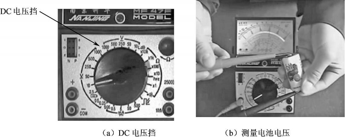 ( 10 )测量 1000V 以下直流电压时,测量选择开关置所需的“直流 V ”挡,如图 2-10 ( a )所示。测量 1000 ~ 2500V 的直流电压时,将测量选择开关置于“直流 1000V ”挡,正表笔插入“交直流 2500V ”专用插孔,如图 2-10 ( b )所示。