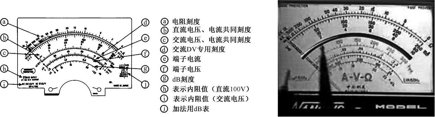 ( 3 ) MF47 型万用表上共有六条标度尺,如图 2-3 所示。从上往下依次是电阻刻度线、电压电流刻度线、晶体管 β 值刻度线、电容刻度线、电感刻度线及电平刻度线。刻度盘上有反光镜,用以消除测量时的视差。在观察读数时,眼睛的视线要与刻度垂直。