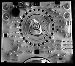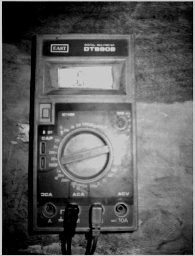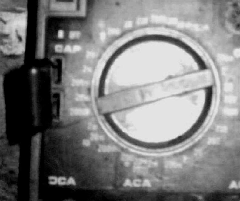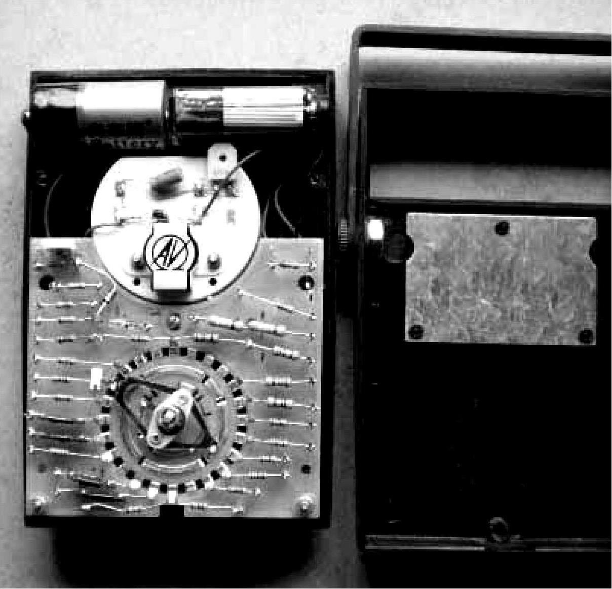 ( 6 )内部电路板如图 2-6 所示。大圆形物体是表头,表头上方是两枚电池,表头下方是电路板。电路板中央为测量选择波段开关,电阻等元件有序地排列在波段开关周围。为防止在使用中置错挡位而烧毁表头,一般采用二极管保护表头。在图 2-5 中可看到,两个硅二极管互为反向地并联在表头两端,使表头两端电压不超过 0.7V 。表头右上部及其左侧的两个微调电阻,供校准万用表时用。