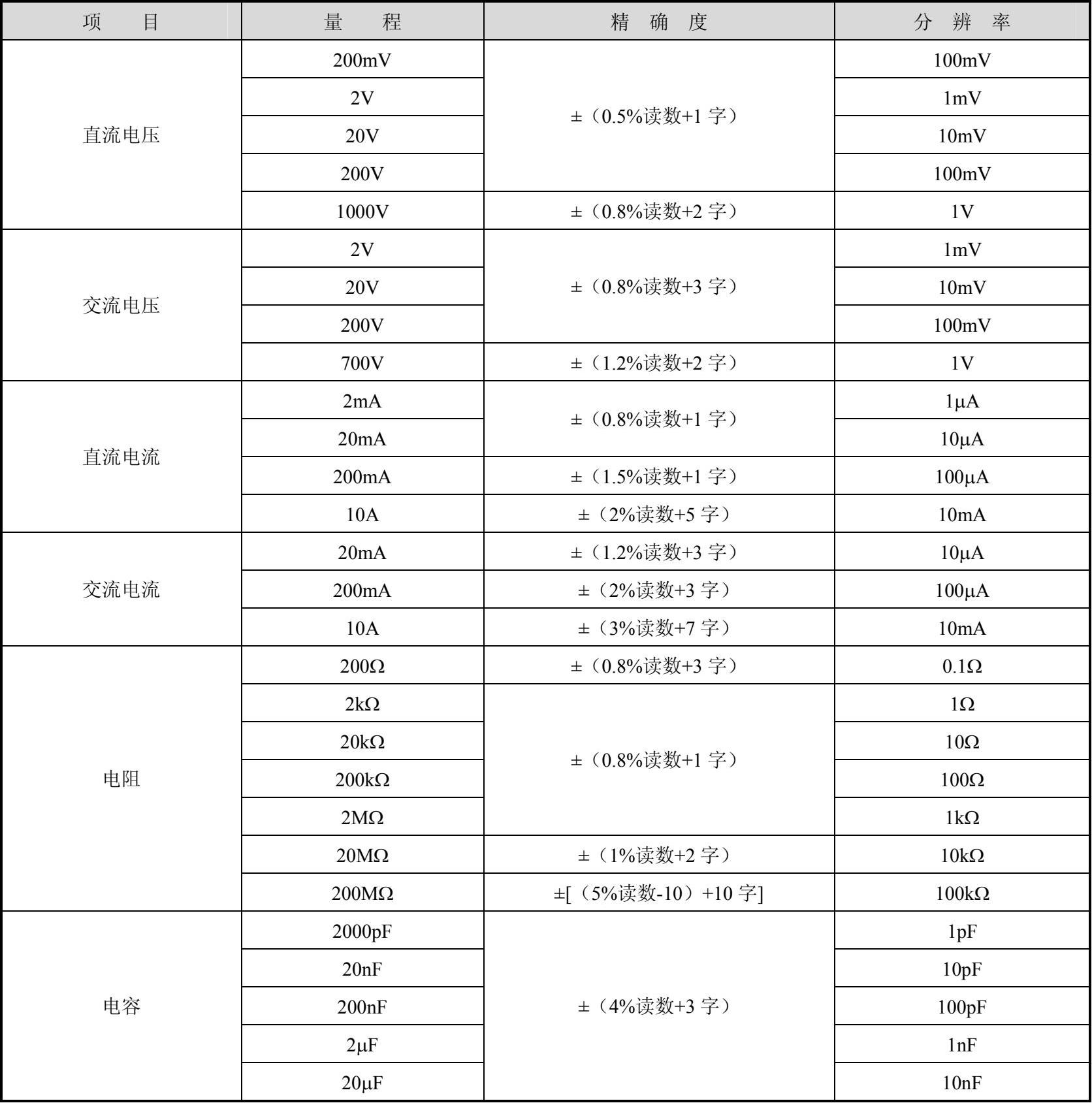 表 2-3 DT890B数字式万用表测量范围及精确度