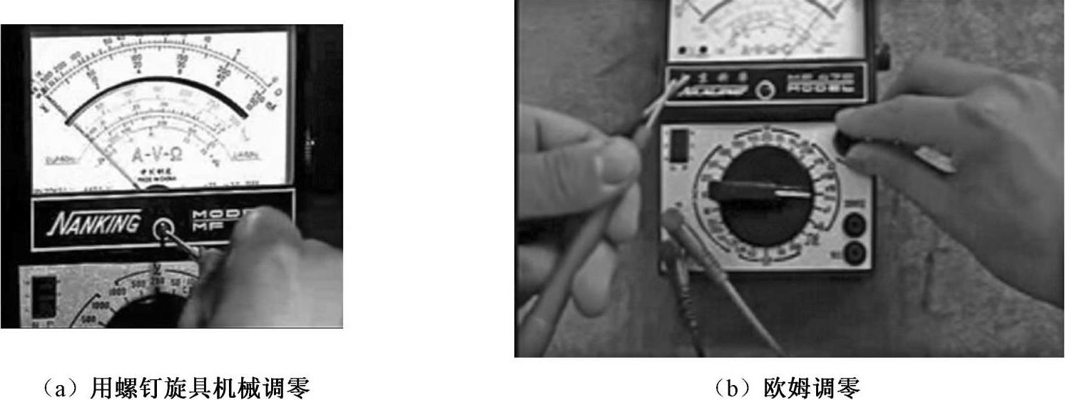 ( 8 )测量电阻时,将测量选择开关置于适当的“ Ω ”挡位,再进行调零操作。调零操作有机械调零和欧姆调零两种方法。用螺钉旋具机械调零如图 2-8 ( a )所示。欧姆调零如图 2-8 ( b )所示,先将两表笔短接,调节面板右上角的欧姆挡调零旋钮,使表针准确指向“ 0 Ω ”。每次换电阻挡后,均应重新调零。
