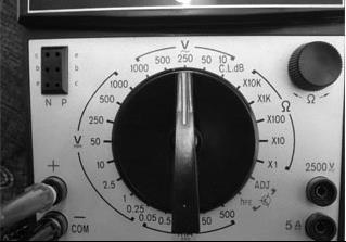 (1)万用表正面(如图 2-1 所示)上部是微安表,中间有一个机械调零器,用以校准表针的零位。下部为操作面板,面板中央为测量选择开关,左下角有正、负表笔插孔,右下角有交直流 2500V 和 5A 专用插孔,右上角为欧姆挡调零旋钮,左上角是晶体管插孔。