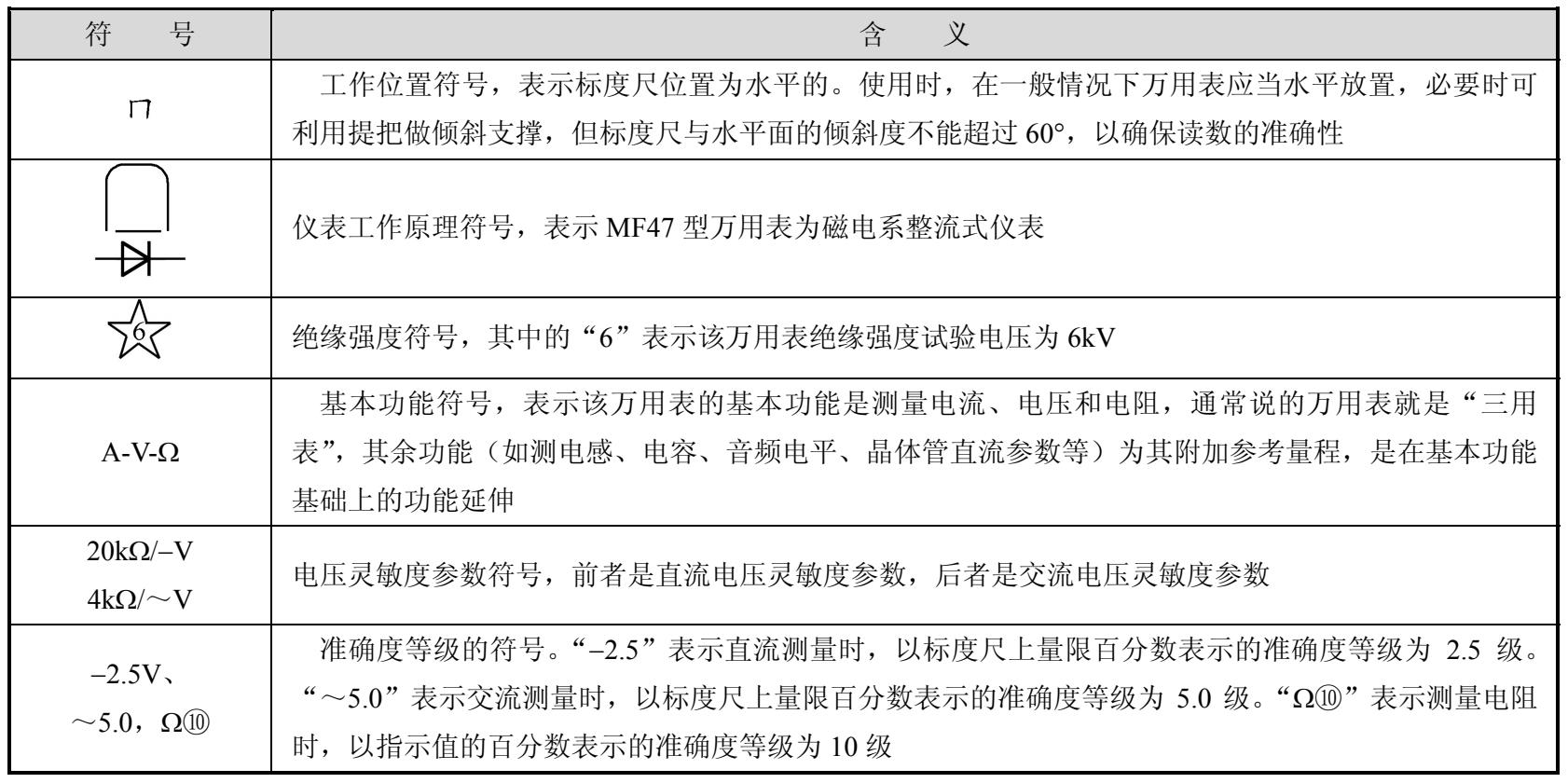 表 2-1 MF47 型万用表表面上几个符号的含义