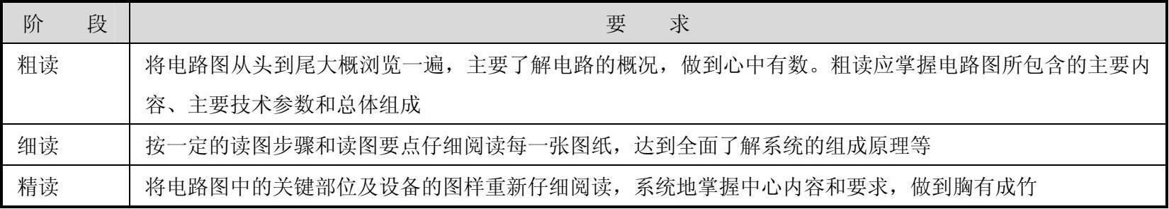 对于比较复杂的电气系统,一般需要经过反复的识读过程才能完全做到真正读懂所有的电气图样。因此,复杂电气系统的读图可以分为三个阶段:粗读、细读、精读,如表 3-6 所示。粗读可比细读“粗”点。这里的“粗”不是“粗糙的粗”,而是相对不侧重在细节上。而精读则是选择重点的或重要的关键内容进行的进一步阅读,是为了保证万无一失而进行的。