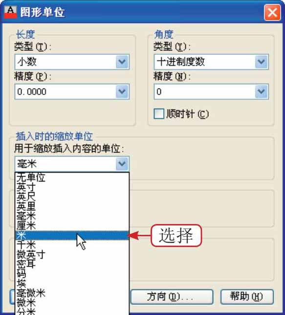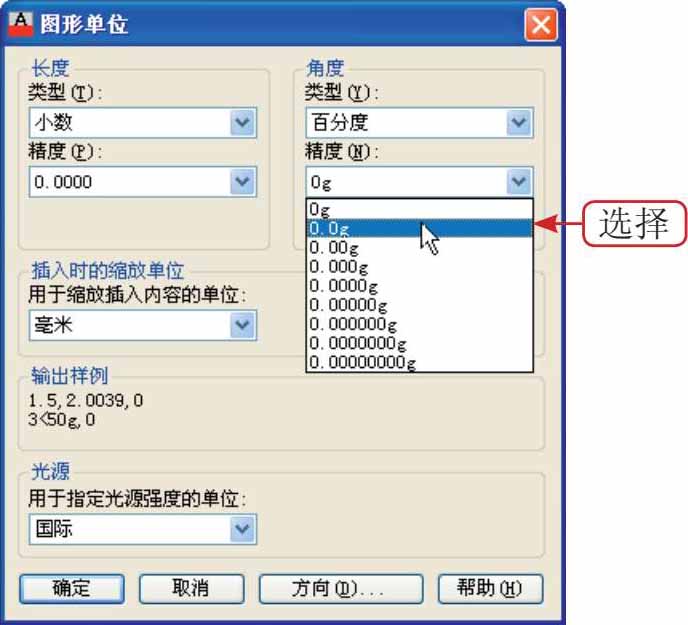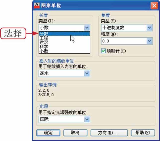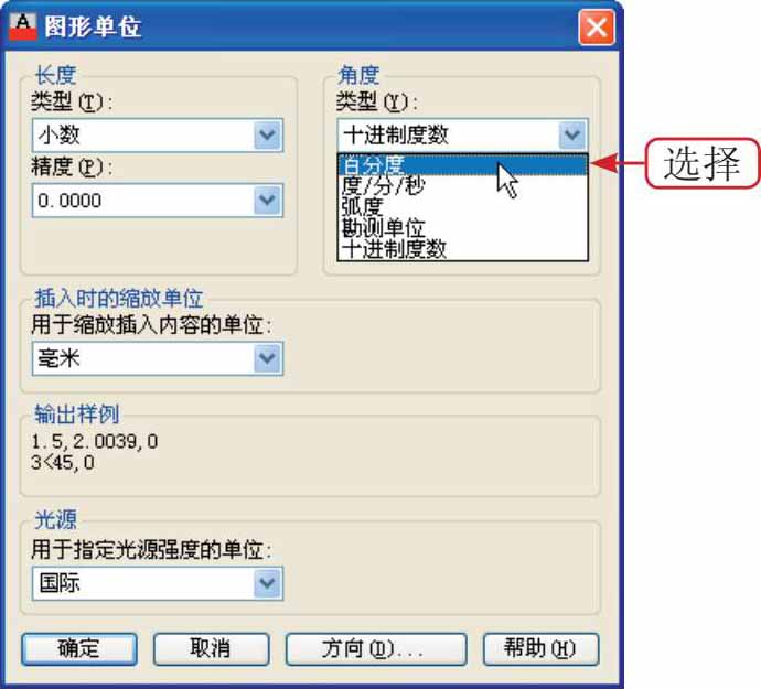 实例解析: 在“图形单位”对话框中的“角度”选项区域,可以指定当前角度的格式和显示的精度。
