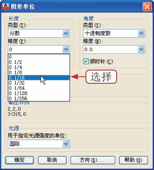 STEP 02 在“长度”选项区域,单击“精度”右侧的下拉按钮,在弹出的下拉列表框中选择“01/16”选项,如图2-17所示,执行操作后,单击对话框中的“确定”按钮,即可完成图形单位的长度设置。