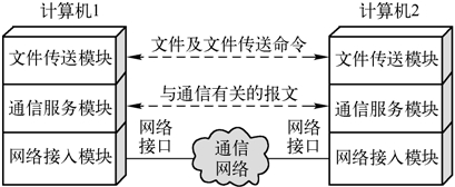 我们可以将要做的工作划分为三类。第一类工作与传送文件直接有关。例如,发送方的文件传送应用程序应当确信接收方的文件管理程序已做好接收和存储文件的准备。若两个计算机所用的文件格式不一样,则至少其中的一个计算机应能完成文件格式的转换。这两件工作可用一个文件传送模块来完成。这样,两个计算机可将文件传送模块作为最高的一层(见图2-4)。在这两个模块之间的虚线表示两个计算机系统交换文件和一些有关文件交换的命令。