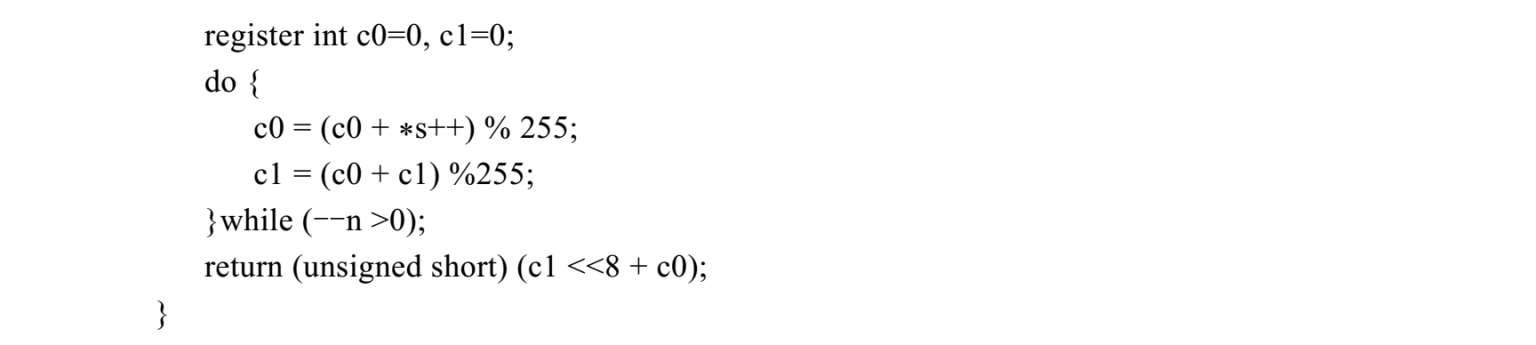 尽管可以通过前面介绍的查表的方法或特殊硬件的方法计算检验和来缩短处理时间,但对于那些允许一定程度的漏检率存在的应用而言,可以采用比CRC检验简单且能够发现比较严重的传输错误的方法来进行差错检测。John Fletcher 在1982提出了这样一种差错检测方法,称为算术检验和。该算法只需用到加法和取模操作,且算法特别简单。下面的代码取自于ISO的类4运输协议(TP4),它是算术检验和的一种实现: