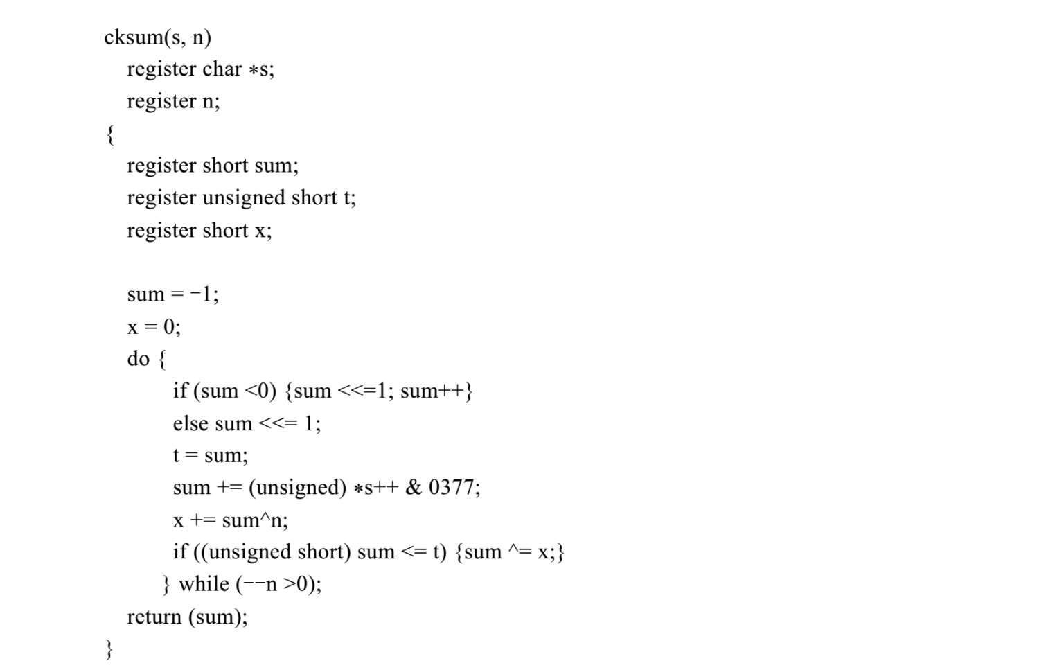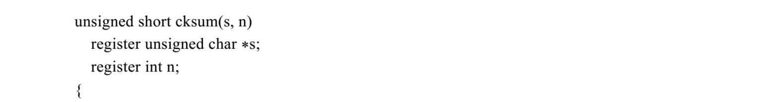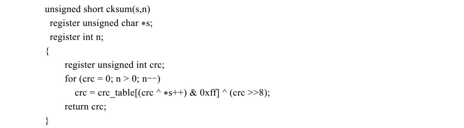与CRC检验比较类似的一种检验方法是UNIX操作系统中uucp应用程序中计算检验和的方法,该方法的C函数cksum(s, n)实现的源代码如下: