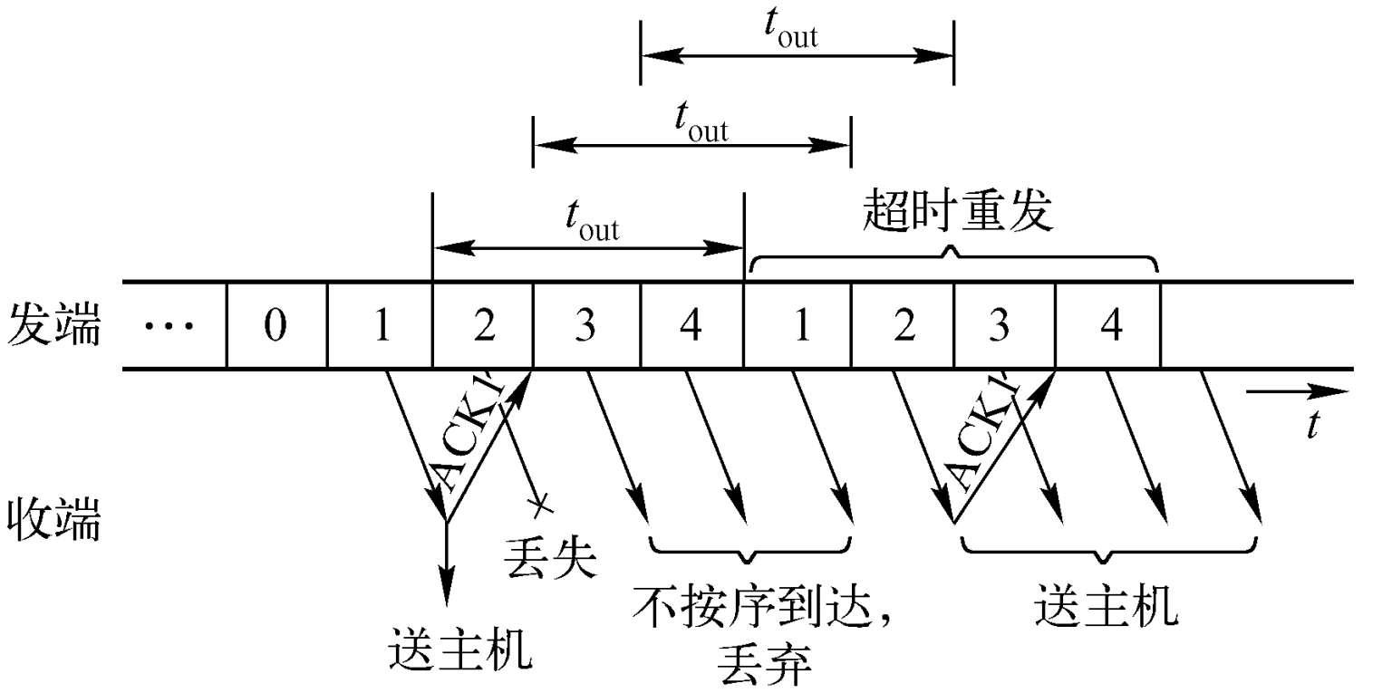 (1)回退n帧(Go-Back-N)。接收方直接丢弃所有不按序到达的数据PDU。并且对于丢弃的数据PDU,不发送确认。如果重传计时器超时之前,发送方的发送窗口已满,则发送方停止发送。最终,发送方从一个否定的确认或超时时所指序号的数据PDU开始,重传所有后续数据PDU。数据链路层的连续ARQ协议使用的就是这种重传方式。图2-10示出了一个回退n帧的重传机制。