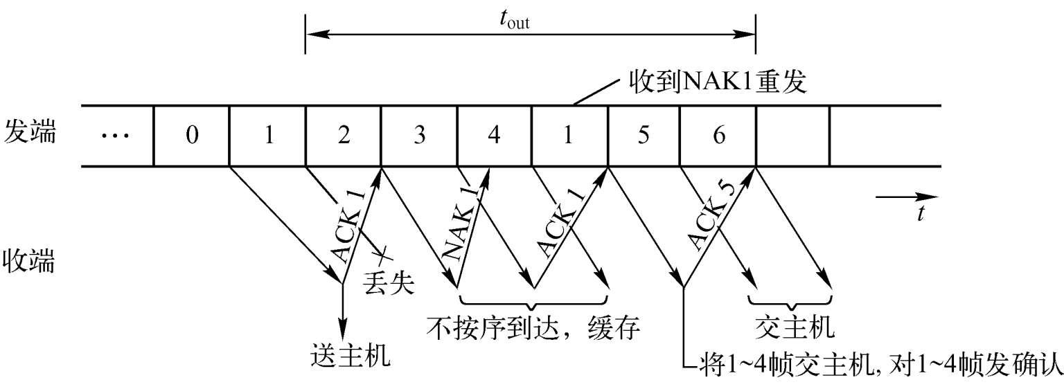 (2)选择重传(Selective Repeat)。发送方只重传否定确认、选择确认和超时中指出的那些数据PDU。数据链路层的选择重传ARQ协议使用的就是这种重传方式。图2-11示出了一个选择重传。