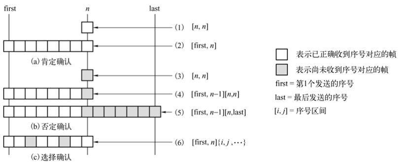 肯定确认、否定确认和选择确认的语义如图2-9所示。图(a)表示的是肯定确认的语义,其中(1)表示序号n对应的帧已正确收到,(2)表示直到n的所有序号对应的帧已正确收到(累计确认)。图(b)表示的是否定确认的语义,其中(3)表示序号n对应的帧已丢失,(4)表示直到n-1的所有序号对应的帧已正确收到,但第n帧还没有收到(累计确认),(5)表示直到n-1的所有序号对应的帧已正确收到,但从n到最后序号对应的所有帧还没有收到(累计确认)。图(c)表示的是选择确认的语义,(6)表示除了所列出的序号所对应的帧以外,直到n的所有序号对应的帧已正确收到。