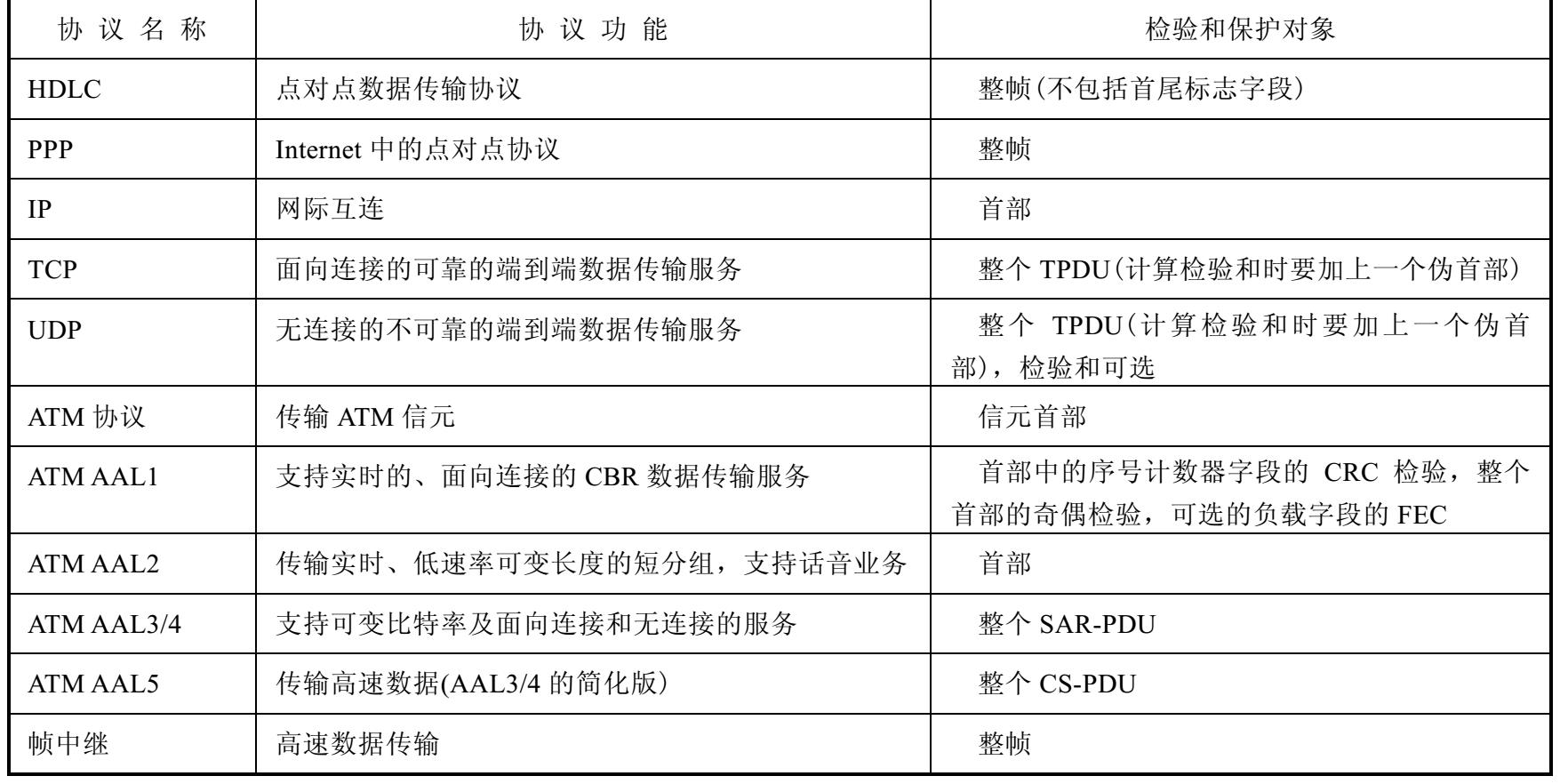 有些协议是对整个数据单元(帧、分组、报文,或统称为PDU)进行检验和保护的,而另一些协议则只需要对数据单元的首部(控制部分)或首部中的某个字段进行检验和保护。选择被保护对象的主要依据是根据协议提供的功能,下层协议提供的服务的特点,以及性能上的要求等。表2-4中列出了部分协议的检验和的保护对象。