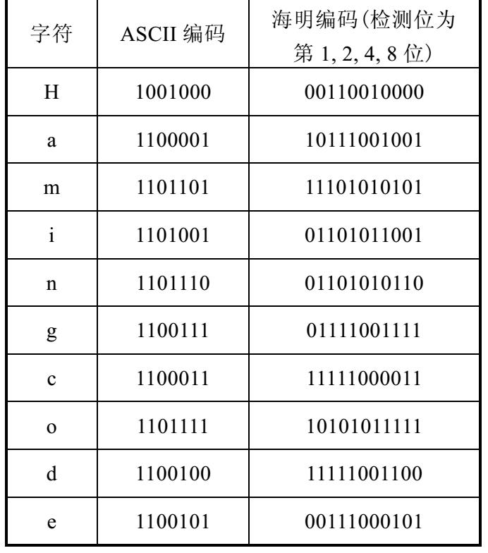 为了说明如何为每个检验位取值,这里以一个7位ASCII字符使用海明码编码形成11位码字为例来说明。这里,m = 7, r = 4, n = 11,显然2 r > 11 + 1 =12, 而且编号1 = 1, 2 = 2,3 = 1 + 2, 4 = 4, 5 = 1 + 4, 6 = 2 + 4, 7 = 1 + 2 + 4, 8 = 8, 9 = 1 + 8, 10 = 2 + 8, 11 = 1 + 2 + 8, 于是有: