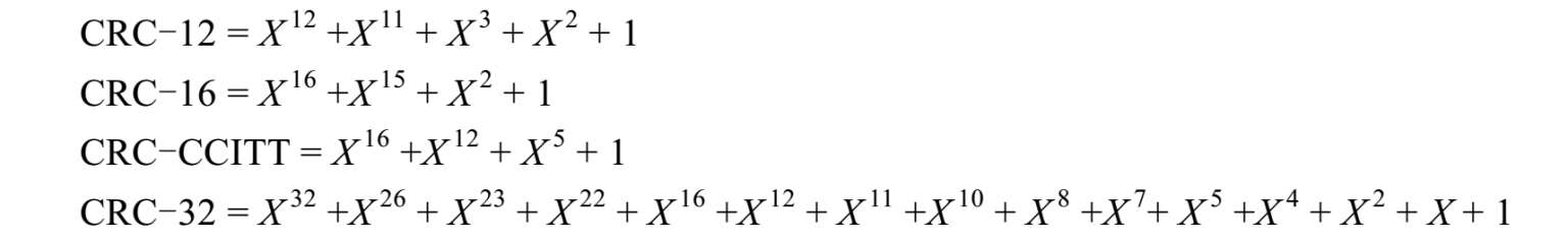 那么能不能说,只要得出的余数R = 0,就一定没有出现差错呢?不可以!因为在某种比特差错的组合下,也可能碰巧使得余数R正好为0。但只要经过严格的挑选,并使用位数较多的除数P,那么出现检测不到的差错的概率就可以是个很小的数值。现在广泛使用的P(X)有以下几种: