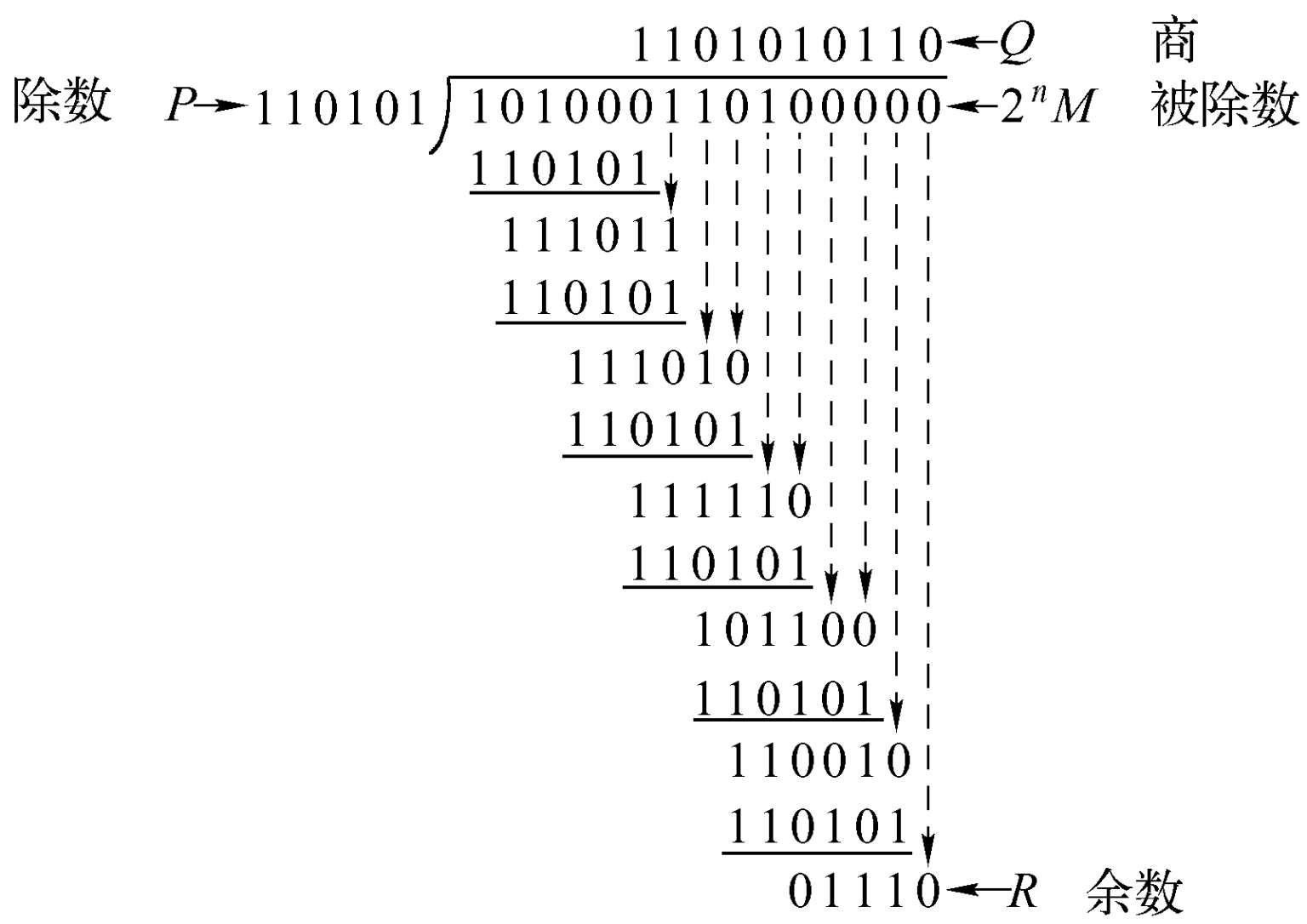 如果数据在传输过程中不产生误码,则接收端收到的应当是2 n M + R。将这个数除以P(模2运算)后,得出的余数显然应当是0(读者可以自己进行类似图2-8的运算。被除数现在是101000110101110,而除数是P = 110101,看余数是否为0)。若数据在传输过程中出现误码,则在接收端进行以上运算后,一般就不会得出余数为0的结果。
