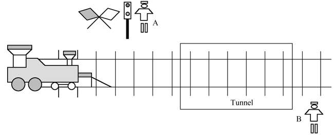 第一列火车司机看到信号灯为绿色,于是没有停下来,直接进入隧道。经过A端的信号灯时,由于信号系统故障导致信号灯没有变成红色,于是告警铃声响起。信号员A听到铃声时,首先向隧道另一端的信号员发送TT信号告之其有火车进入隧道,然后使用红色旗帜向下一列火车发出警告。