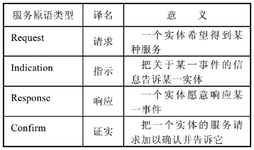 同一系统中相邻两层的实体进行交互(即交换信息)之处,通常称为服务访问点(SAP,Serivce Access Point)。在进行交互时所要交换的一些必须信息(或命令)称为服务原语(Service Primitives),以表明需要本地的或远端的对等实体做哪些事情。在OSI中规定了每一层均可使用的4种服务原语:Request、Indication、Response、Confirm,如表2-1所示。OSI将层与层之间交换的数据的单元称为服务数据单元(SDU,Service Data Unit)。换句话说,一个(n)服务数据单元就是(n)服务所要传送的逻辑数据单元。SDU就是数据PDU中的用户数据,但不一定是一一对应关系。例如,可以是多个SDU合成为一个PDU(称为“拼装”),也可以将一个SDU划分为几个PDU(称为“分段”)。
