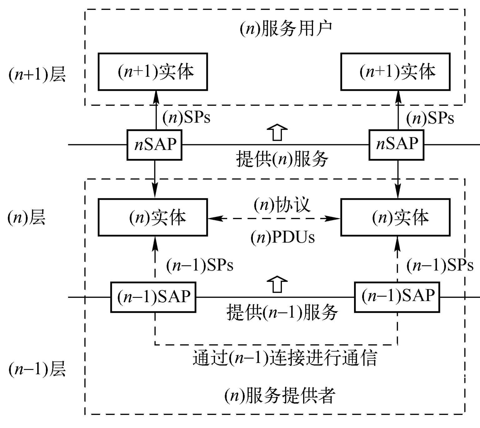 在讨论协议设计之前,我们先给出协议模型。对于复杂的协议设计,一般采用分层的方法来实现(见2.3节)。下面我们用OSI体系结构中的概念来描述n层协议模型,如图2-1所示。在OSI中,实体(entity)表示任何可以发送和接收信息的硬件或软件进程。在许多情况下,实体就是一个特定的模块。两个(n)实体在(n)协议的控制下通信,使(n)层能够向上一层(n + 1)提供服务。这种服务就是(n)服务。接受(n)服务的是上一层实体,即(n + 1)实体。它们也称为(n)用户或更严格地称为(n)服务用户。