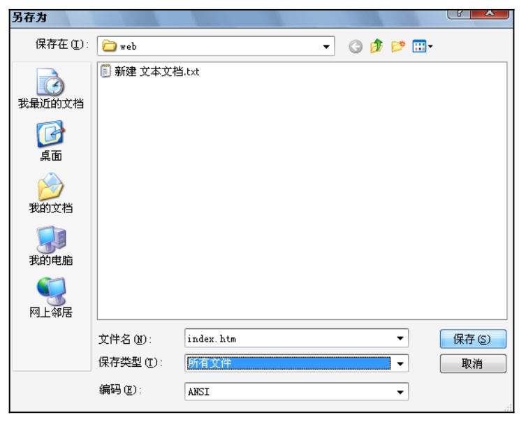 (6)在记事本菜单栏选择“文件|另存为”命令,确认保存路径为“D:\web”,“文件名”项使用“index.htm”,“文件保存类型”项选择“所有文件”,如图2.16所示。