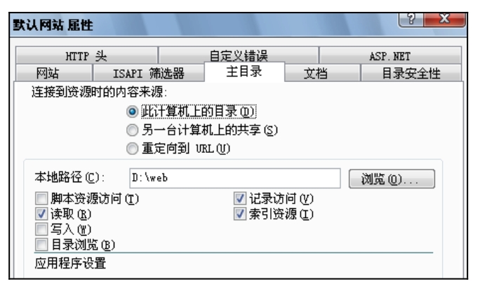 (3)在IIS窗口中右击“默认网站|属性”选项,“IP地址”选项为“(全部未分配)”,如图2.13所示,“主目录”选项卡的“本地路径”选项为“D:\web”,如图2.14所示,“文档”选项卡的“默认文档”为“index.htm”,如图2.15所示。