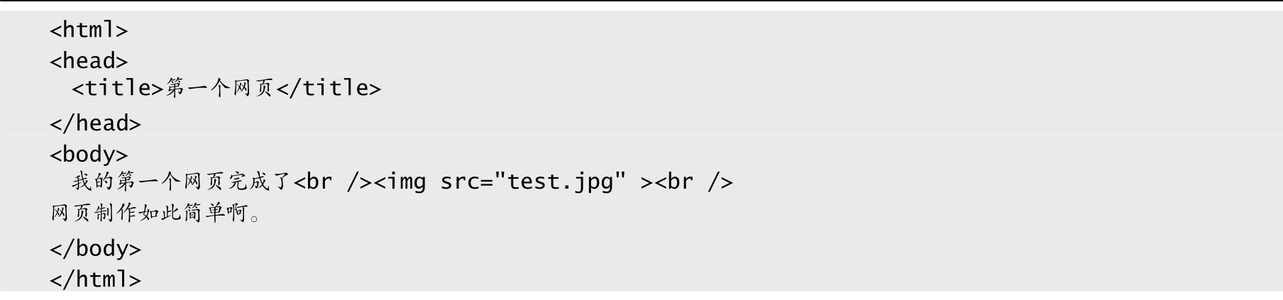 注意 :代码中的<img>标签为单标签,用于显示图片,用src指向图片路径,因为图片和网页文档位于同一目录下,所以图片路径采用相对文档路径。