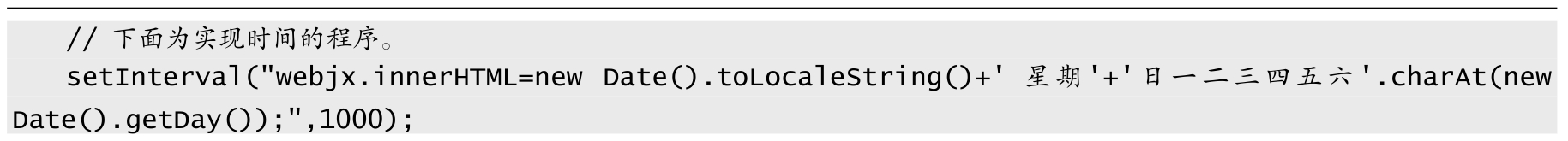 time.htm页面显示了time.js中的程序运行结果。由代码6.4所示可知,通过修改头部信息,双标签<script></script>的src属性可以连接外部的JavaScript程序。当网站内的多个页面需要时间程序时,就可共用一个time.js程序了。