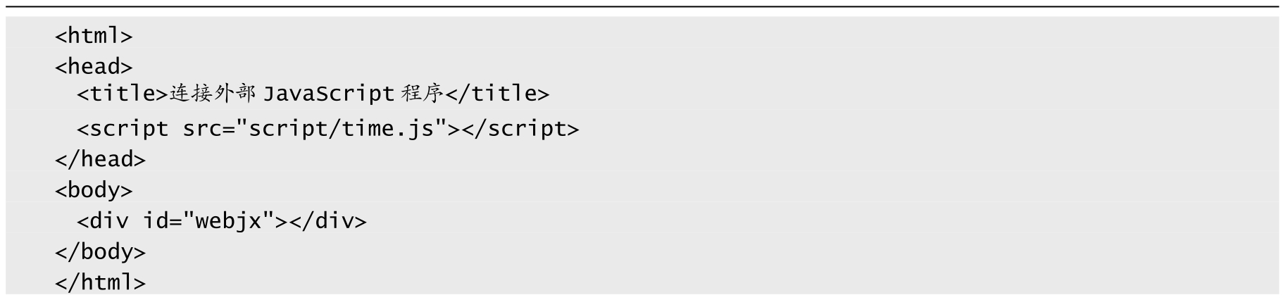 JavaScript技术是网页技术的一个重点,在前面学习头部信息的时候,学习过HTML头部代码如何嵌入JavaScript程序。在很多网站应用中,部分JavaScript程序是很多网页共用的,这时JavaScript程序必须以单独的文件形式独立于网页。本节以一个小例子来说明怎样连接外部的JavaScript程序文件。在D:\web\目录下创建script目录,并在script目录中放入一个JavaScript程序,文件名为time.js,编写代码如代码6.3所示,HTML页面如代码6.4所示。