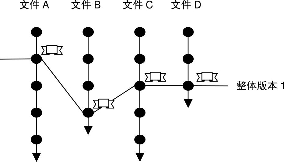这招不错,解决了记录整体版本的问题。但它也有一些弱点。比如,在每个文件上都要打标签,创建一个包含众多文件的程序的整体版本就可能会比较费时间。另一方面,不同整体版本的标签很可能打在某个文件的相同的版本上。这个版本上,可能挂着几个标签,可能挂着几十个标签,也可能挂着几百个。