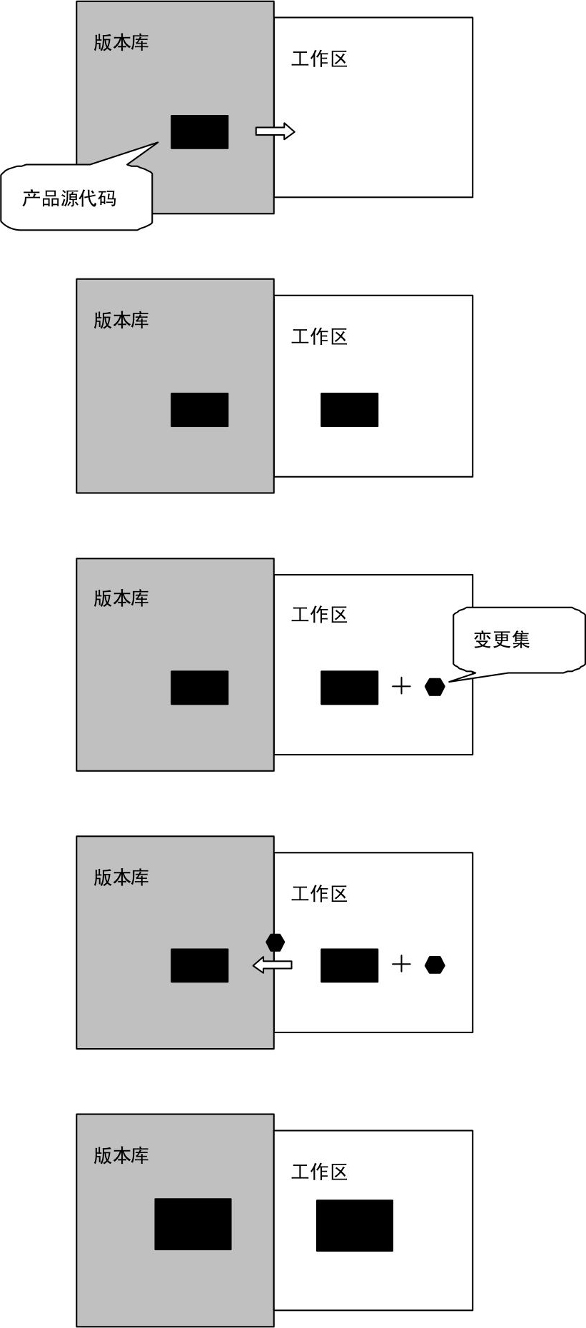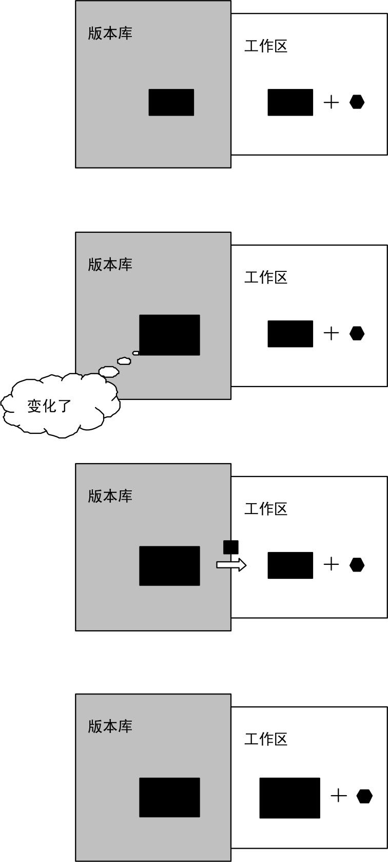 [Subversion] 用相对简单的方法支持变更集。变更集有标题,这对应于变更集提交(Commit)时输入的注释。一个变更集,对应一次提交,也就是一次签入,不支持工作中文件的中间版本的保存。工作区中是一个未完成的变更集,完成后就提交。 [Git] 与Subversion相比,有更多的缓冲。首先,从工作区正式提交(commit命令)到本地私有版本库之前,可以先暂存(add命令)。其次,可以在本地版本库里累积几个变更集,一起提交(push命令)到服务器上的公共版本库,让别人看见。后者是分布式版本控制方法(第3.5节)带来的功能。当然,分布式版本控制方法也意味着,提交变复杂了,包括从工作区到本地私有版本库,再从本地私有版本库到服务器上的公共版本库这两步。