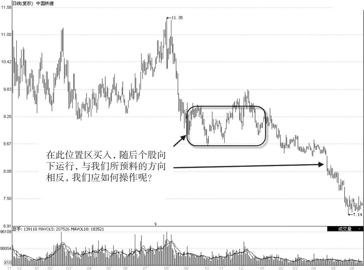 如图1-3为中国铁建这只股票2008年11月至2010年6月期间走势图,如图所示,如果我们在图中标注的横向震荡走势中买股入场的话(此时的个股前期下跌幅度较大,而且有业绩支撑,此位置区从其整体运行来看,是处于低点位的,因而,我们是有理由买股入场的),随后,此股并没有如我们所预期的那样出现上涨,反而是向下跌破了这一横向震荡区。这意味着我们手中的股票处于亏损状态,此时,我们应如何操作呢?