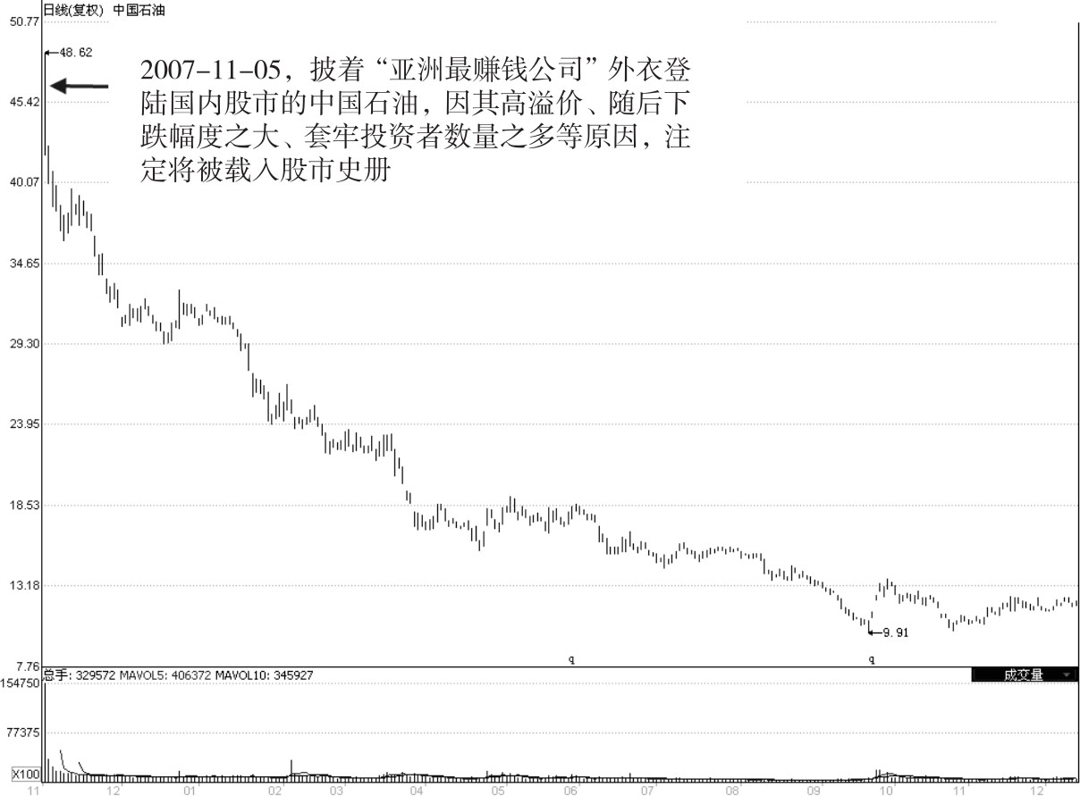 虽然,中国石油有着“亚洲最赚钱公司”的名头,但过高的发行价、加之上市首日开盘时的巨大上涨幅度,使得此股过度地透支其随后的上涨空间,但是,市场却很看好此股的成长空间,当时市场正刮价值投资之风,很多投资者特别是中小散户投资者,在媒体的大力吹捧下,买入了此股。从此股后期的走势来看,这些持股者若未能及时止损出局,其亏损将是极为惨重的,至2008年11月,在不到一年的时间里,此股的股价从2007年11月的48元区间跌至10元区间,这意味着,如果我们在此股上市首日买入10万元此股并一直持有,则当时间来到2008年11月,这10万元将缩水至2万元左右,亏损幅度相当巨大。
