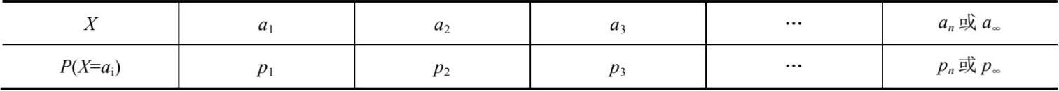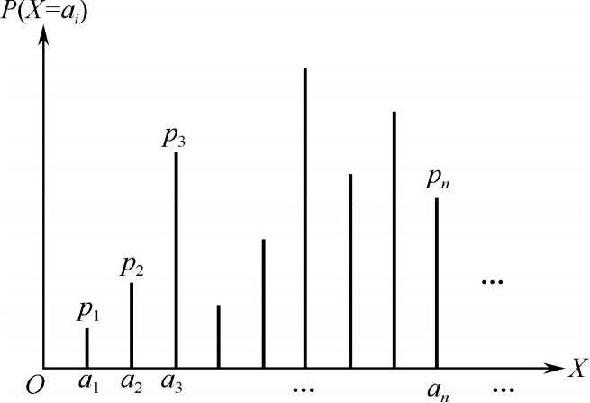 随机变量在其值域(离散型是离散集合;连续型是连续集合)内的概率分布是一个很重要的问题。离散型随机变量从有限集合或可列集合中取值,所以其概率分布总可以列成两行多列的表格(如表 2-2 所示)或图形(如图 2-4 所示)的形式。
