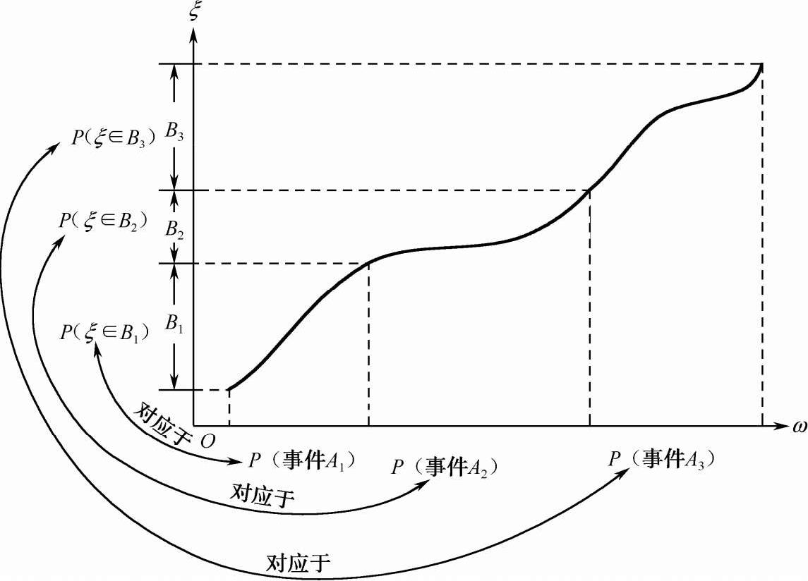 随机变量ξ (ω)取某些值(或位于某个区域)总可以映射成基本事件空间Ω的某个子集,如图 2-3 所示,所以可以通过计算该事件的概率得到ξ (ω)取这些值的概率。但在实际应用中随机变量的直观意义比样本空间Ω或事件的意义更为清晰明了,所以可以直接使用随机变量,而不必指明样本空间Ω。