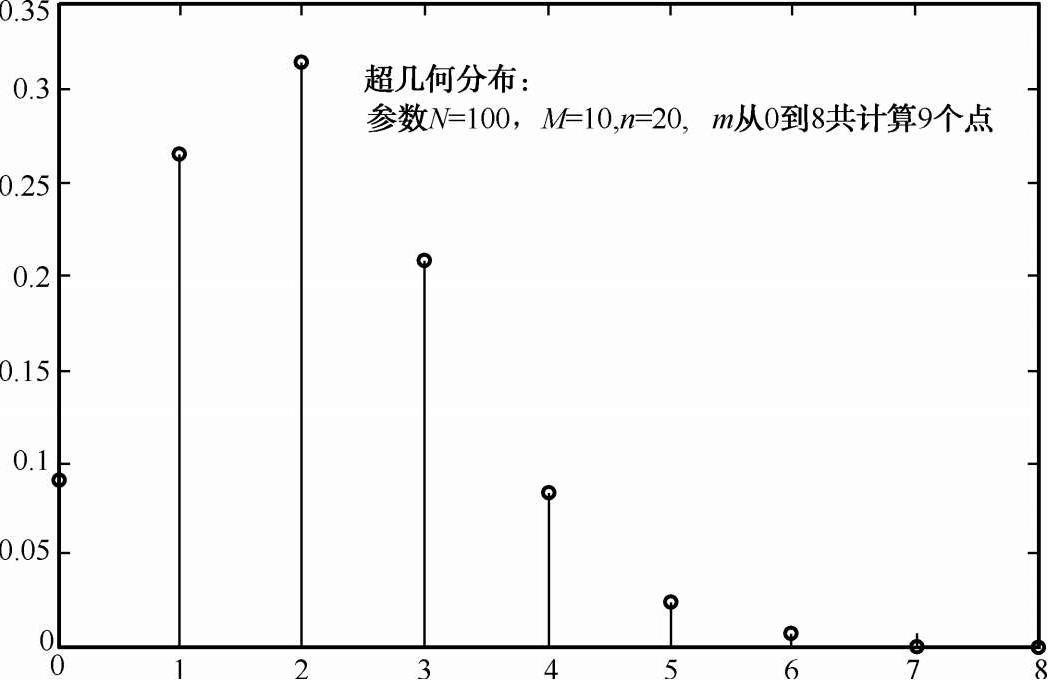 称X的分布为超几何分布,记作X~H(n,N,M)。取参数N=100,M=10,n=20 的超几何分布如图 2-9 所示。