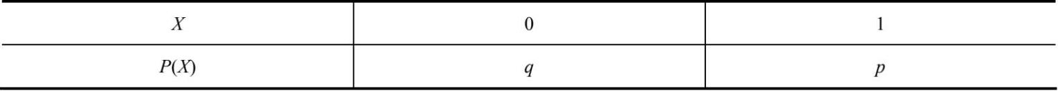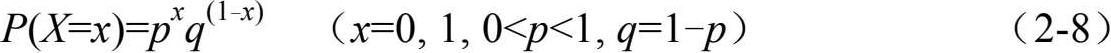 其中 0<p<1,q=1-p,则称X的概率分布符合两点分布,其物理试验原型是扔硬币试验,把一面朝上记作X=0,另一面朝上记作X=1,其概率分布也可记作