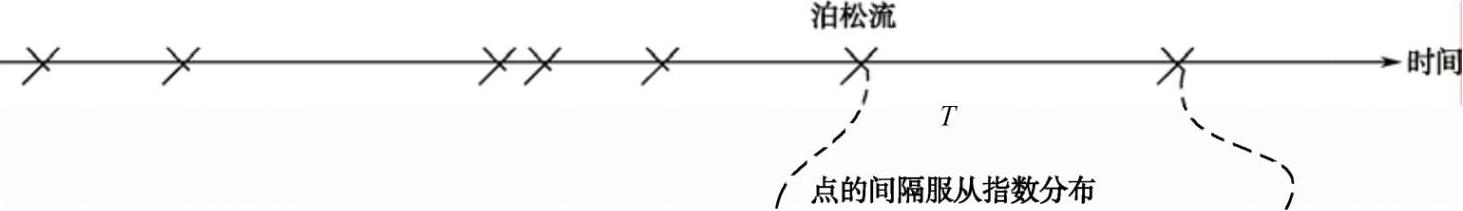 指数分布与泊松分布有着密切关系,事实上,在泊松流中,事件点之间的间隔T如果看做是随机变量,是服从指数分布的,如图 2-13 所示。