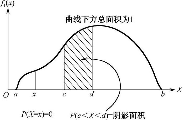 连续型随机变量X从不可列集合中取值,所以其概率分布应该是一个连续函数。对于这种情况,X等于某个单值的概率已经没有意义,只能说X位于某个区间(c, d)的概率是多少,如图 2-5 所示。