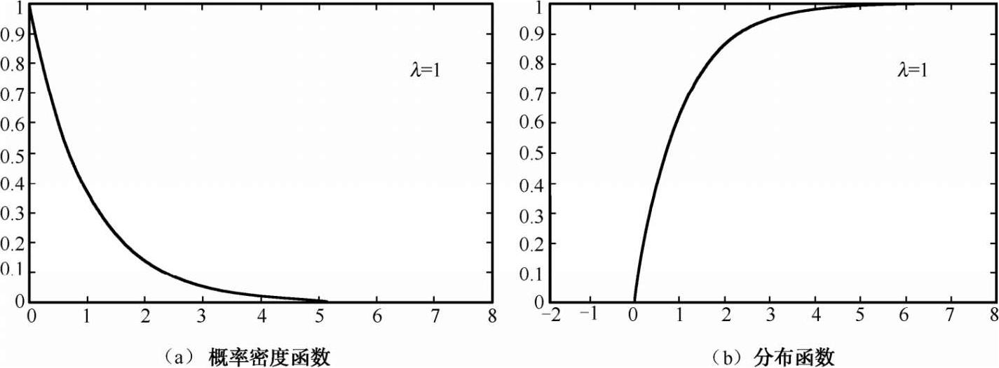 其中,λ>0 为常数。λ=1 的指数分布的概率密度函数和分布函数如图 2-12 所示。