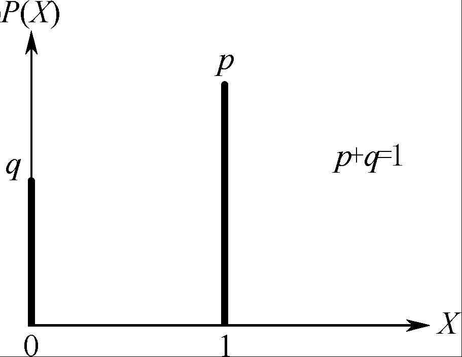 如图 2-6 所示,可见,两点分布用于描述只有两种结果的随机试验,这种概率分布虽然简单,却是构成很多其他分布的重要基础。