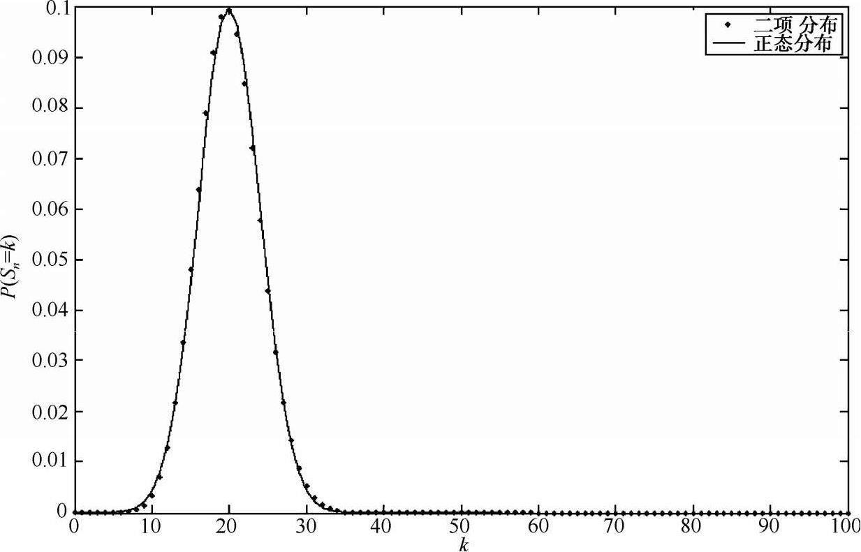 即随机变量S n 在其均值np附近近似服从正态分布N(np, npq),这个结论被称为DeMoirve -Laplace局部极限定理。该定理说明当n充分大时,大量的服从两点分布的随机变量的和S n 近似服从正态分布N(np, npq),因此我们可以用正态分布来逼近二项分布。以参数p=0.2 为例绘图 2-17 和图 2-18。