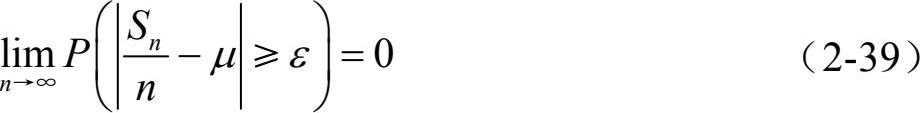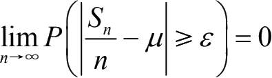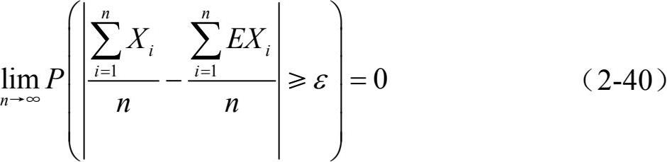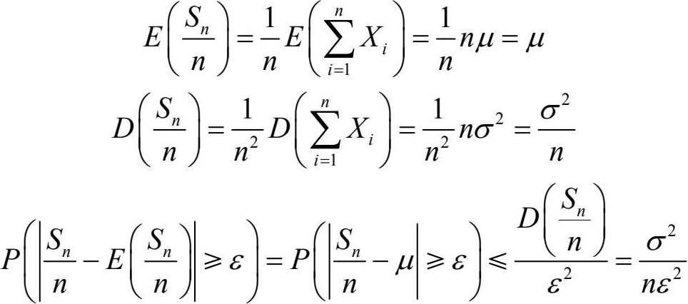 设独立随机变量X 1 , X 2 , X 3 ,…, X n 的数学期望E(X 1 ), E(X 2 ), E(X 3 ),…,E(X n )和方差D(X 1 ), D(X 2 ), D(X 3 ),…,D(X n ) 都存在,且方差有公共上界K,则对于∀ ε> 0,有