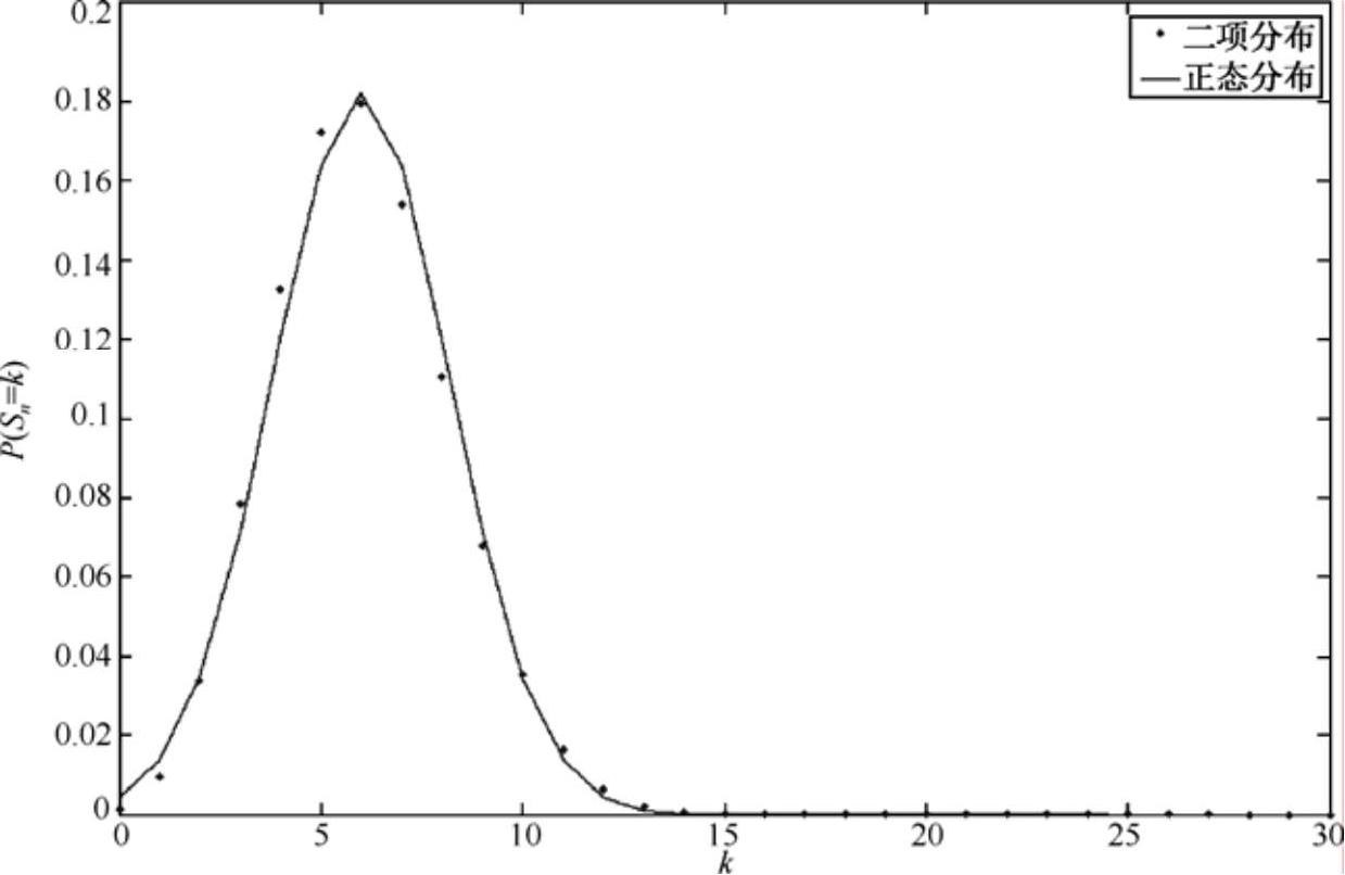 图 2-17 p=0.2,n=30 的二项分布与正态分布