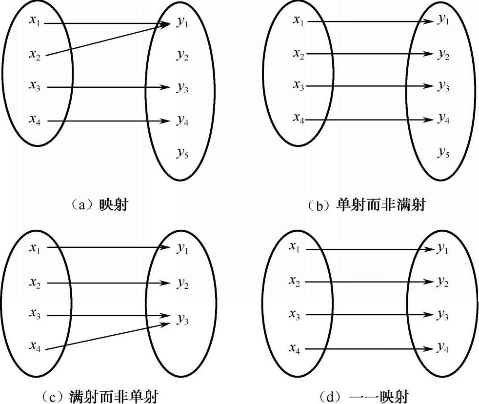 对于映射f的值域ran(f )中的每个象元素y,若唯一的存在自己的原象x,则称该映射为单射。