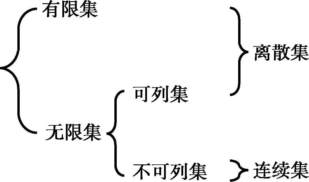 根据 1.4.2 节的讨论,我们可以根据集合的基数对集合加以分类,分为有限集和无限集,无限集又分为可列集和不可列集。在工程应用中,经常用术语离散集和连续集,其中离散集包括了有限集和可列集,连续集则指不可列集。其分类关系如图 1-4 所示。