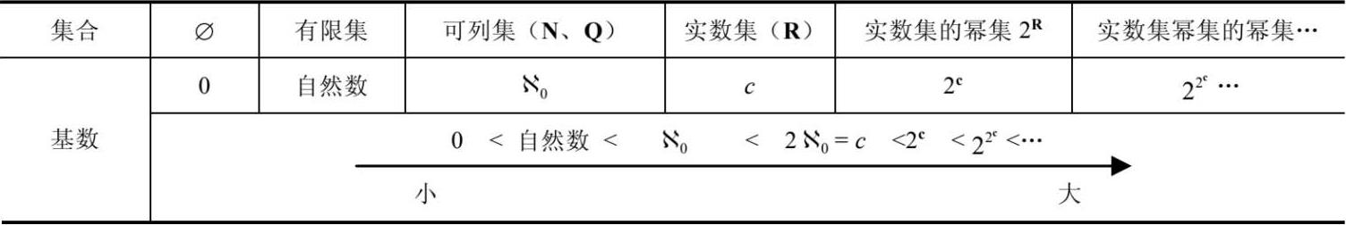 按照基数从小到大的次序可以把各种集合排序,如表 1-1 所示。