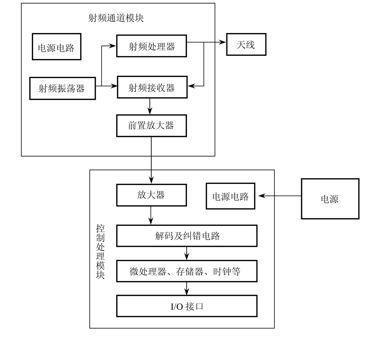 读写器射频通道模块与控制处理模块之间的接口主要为调制/解调信号和必要的控制信号。由于接口位于读写器设备内部,各厂家的约定可能并不相同,实际上,在读写器系统的实现中,通常将调制/解调部分划归射频通道模块。此外,射频通道模块也包括解调之后对回波小信号的必要加工处理(如放大、整形等)。更为一般的情形是将射频通道模块集成化,提供单芯片的射频通道模块,如高频的射频通道模块,得州仪器(TI)公司的S6700和韩国3ALogics公司的THR031芯片等。